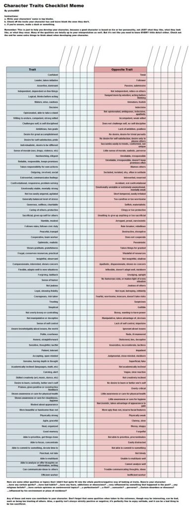 If you need some help with traits for your character here is a graphic with an extensive list. Happy character building and I will be back next week with a short story! ?